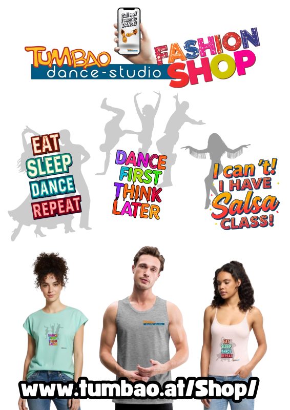Ab Samstag 00.00 Uhr früh ist unser neuer Fashion Workshop online! Unter www.tumbao.at/Shop/ findet ihr unsere neuen Designs wie „Eat, Sleep, Dance, Repeat“ oder „Dance First, Think Later“. Klickt euch durch den Shop, wir starten gleich einmal mit einem MINUS 25% Angebot für alle Bestellungen am Samstag und Sonntag!