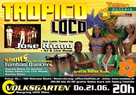Das ist die heisseste Latin Party der Stadt. Höhepunkte sind die drei life Shows der Tumbao Dancers sowie die live Tanzmusik von Jose Ritmo & Band.